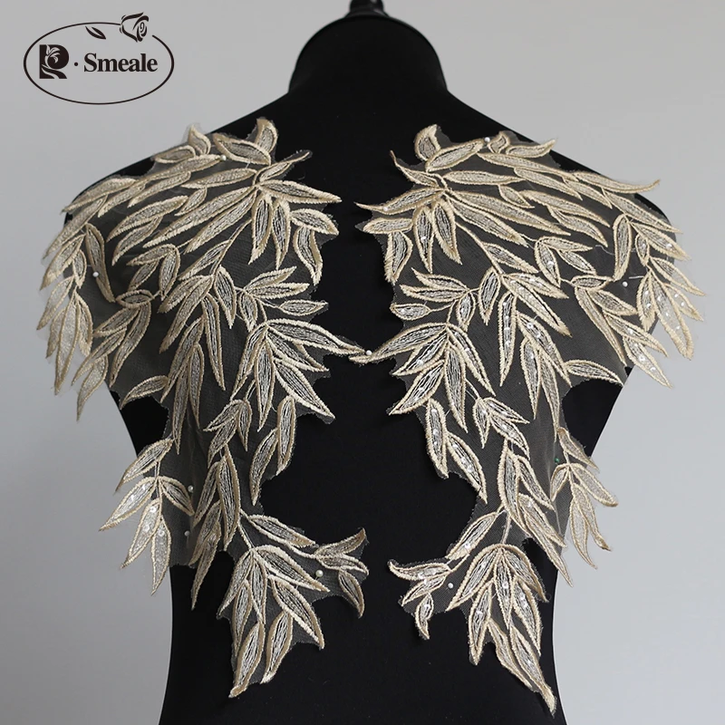 2 пары/4 шт Золотой бамбуковый лист кружева блестки зеркальный цветок аппликация патч кружева свадебное платье костюм Diy Ткань аксессуары ...