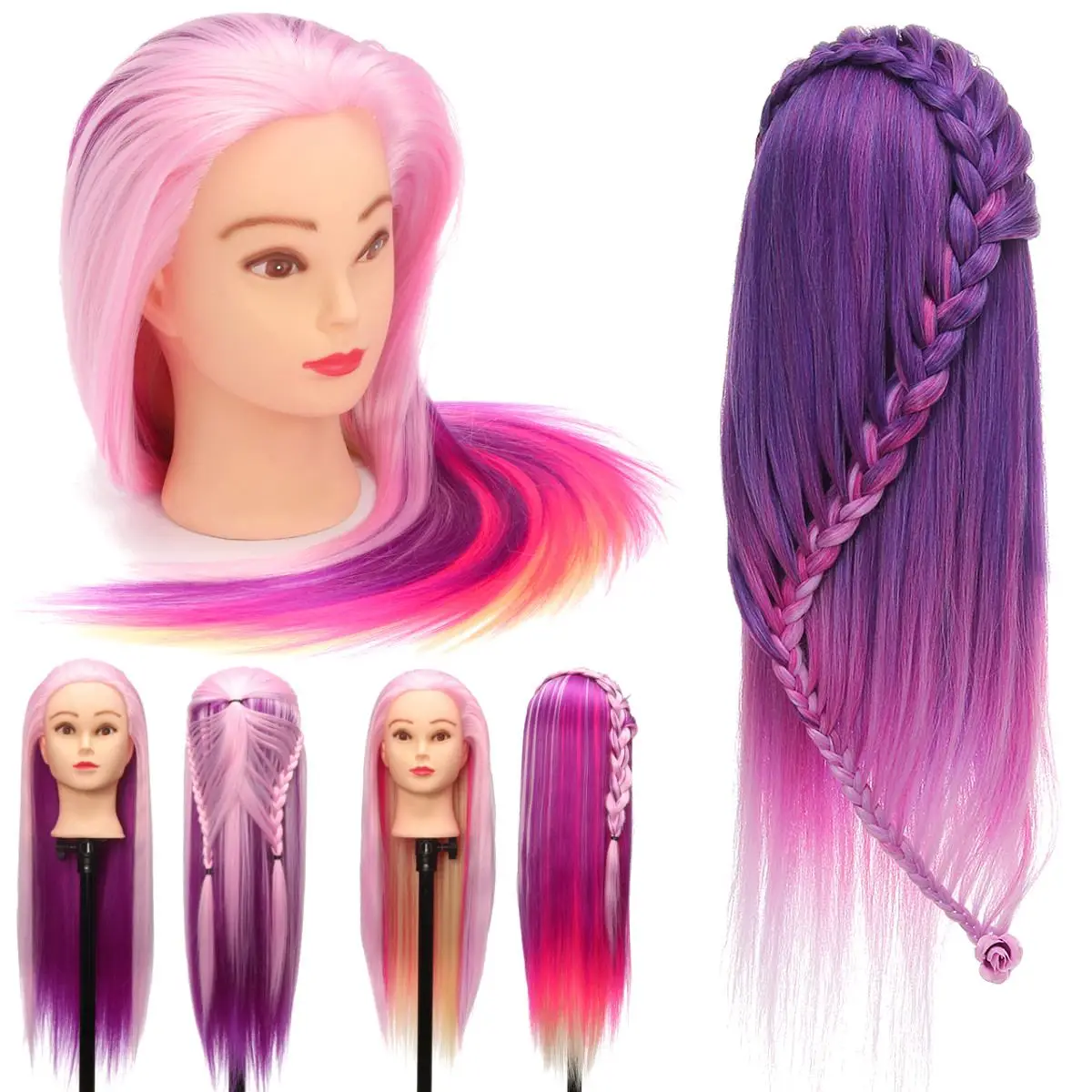 27" Colorful Manikin Rainbow Dolls Head With 90cm Purple Fiber Long Hair Hairdressing Cosmetology Salon Mannequin Training Head