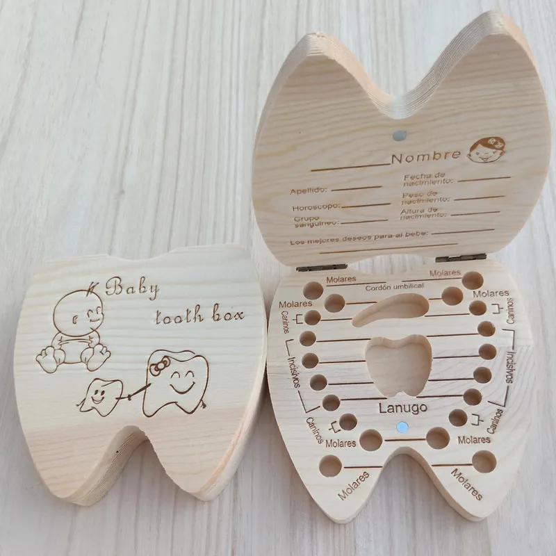 Коробочка для молочных зубов органайзер для детей английский испанский форма зуба ребенок сохранить зубы молока деревянный ящик для хране...