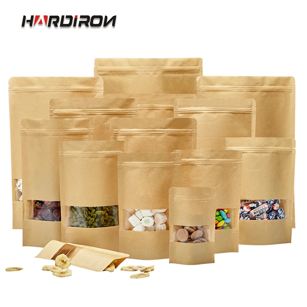 100 шт. коричневый стоя Kraft бумага сумка с молнией еда класс спереди прозрачное окно влагостойкие упаковочные мешки для хранения