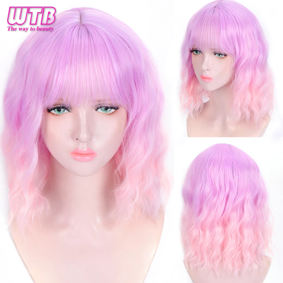 WTB дамские накладные волосы синтетические короткие волнистые парики с челкой женские водно-волнистые парики термостойкие волокна микс фиолетовый 7 цветов