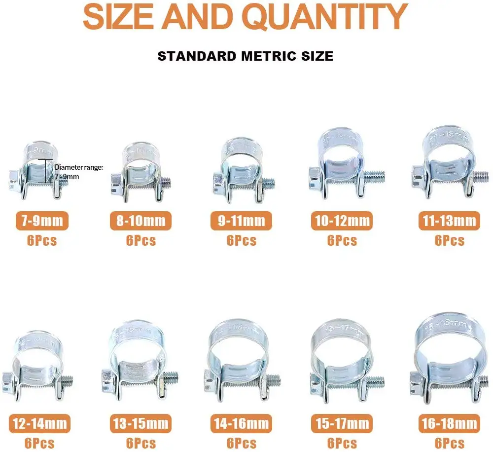 60 шт. 10 размеров Регулируемый оцинкованный углеродистая сталь мини впрыска топлива стиль хомут для шланга Ассортимент Комплект для различн...
