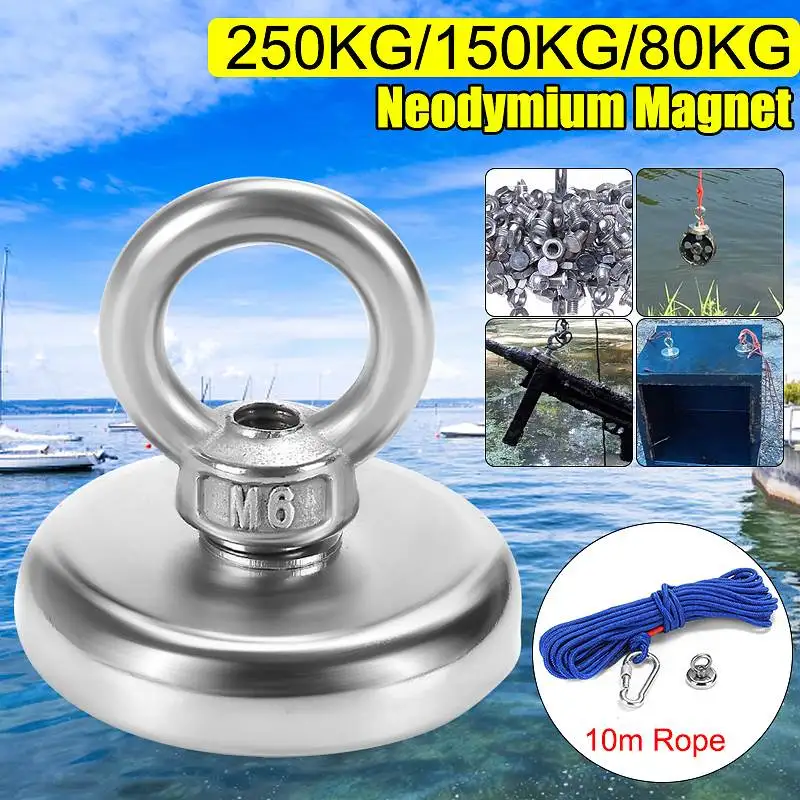 Горячая Распродажа 250 кг/150 кг/80 кг мощный круглый магнит неодимовый магнит крючок спасательный магнит морской рыбалки оборудование держатель с защитой от повреждений и кольцом и 10 м веревки