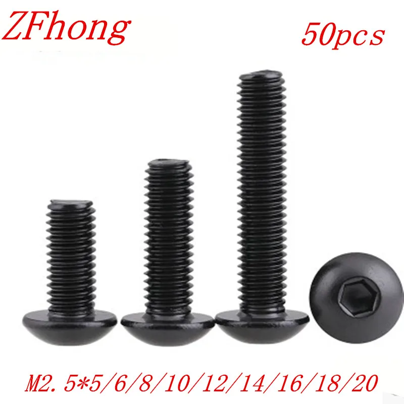 50 шт., M2.5, 2,5 мм, ISO7380, легированная сталь, 10,9 уровня, черная шестиугольная головка, винты, мебель, Грибная крышка, шестигранные болты