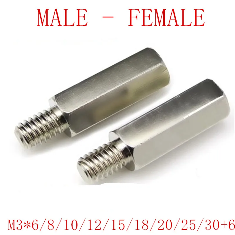 20 шт./лот m3 * L + 6 никелированной латуни Шестигранная стойка M3 * 6/8/10/12/15/18/20/25/30 + 6 Мужской Женский никель латунь spacer