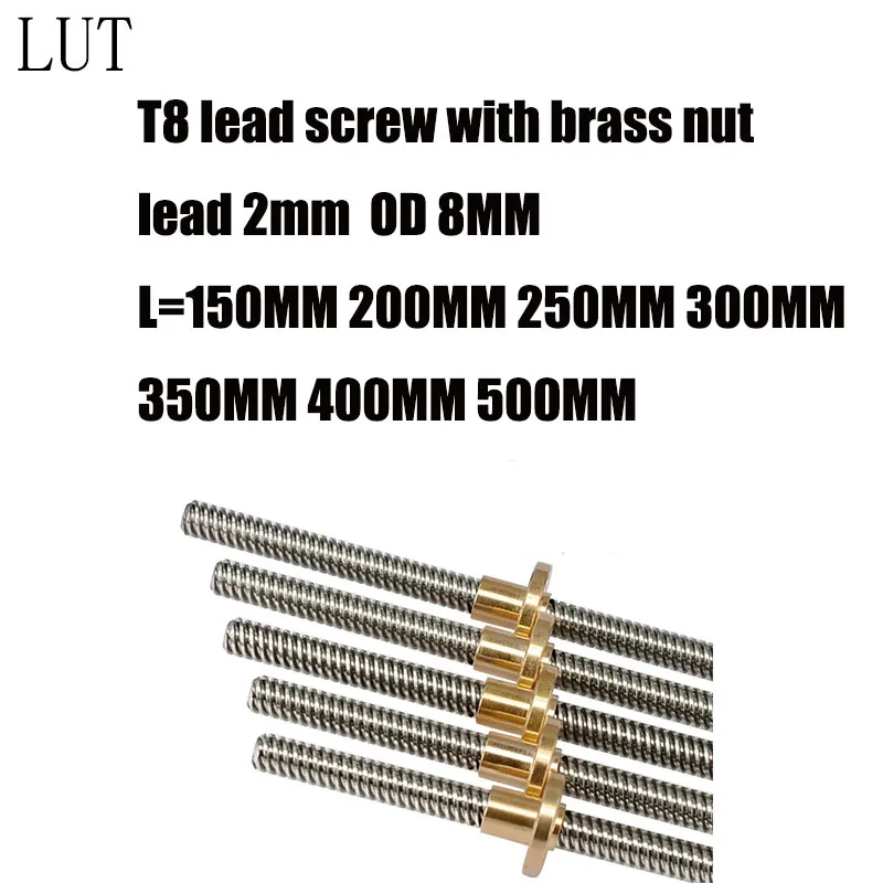 T8 свинцовый Винт OD 8 мм шаг 2 мм свинец 2 мм 150 мм 200 мм 250 мм 300 мм 350 мм 400 мм 500 мм с латунной гайкой для Reprap 3D принтера оси Z