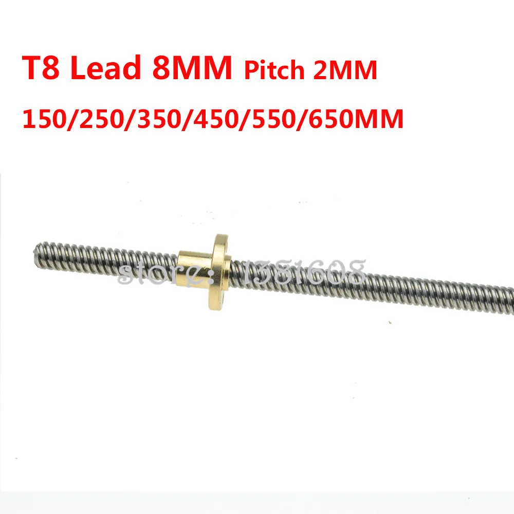 1 шт. T8 привести Винт OD 8 мм Шаг 2 мм привести 8 мм Длина 150/250/350/450/550/650 мм с латунной гайкой для 3D-принтеры и ЧПУ
