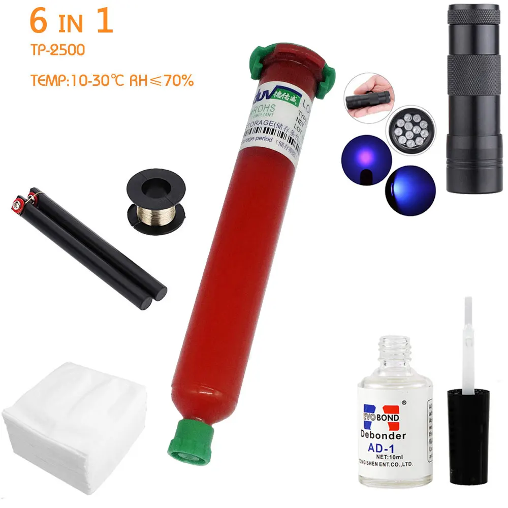 6 in1 LOCA tp-2500 УФ Клей 50 мл + 12led УФ отверждения свет + УФ Клей Remover 20 г резка провода м одежда для ЖК дисплей сенсорный экран ремонт