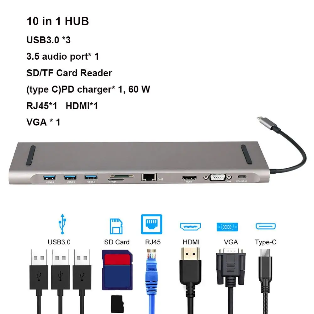 USB C концентратор типа C для мульти USB 3,0 HDMI VGA RJ45 SD Card Reader для MacBook Pro адаптер USB-C 3,0 сплиттер порт USB-C концентратор
