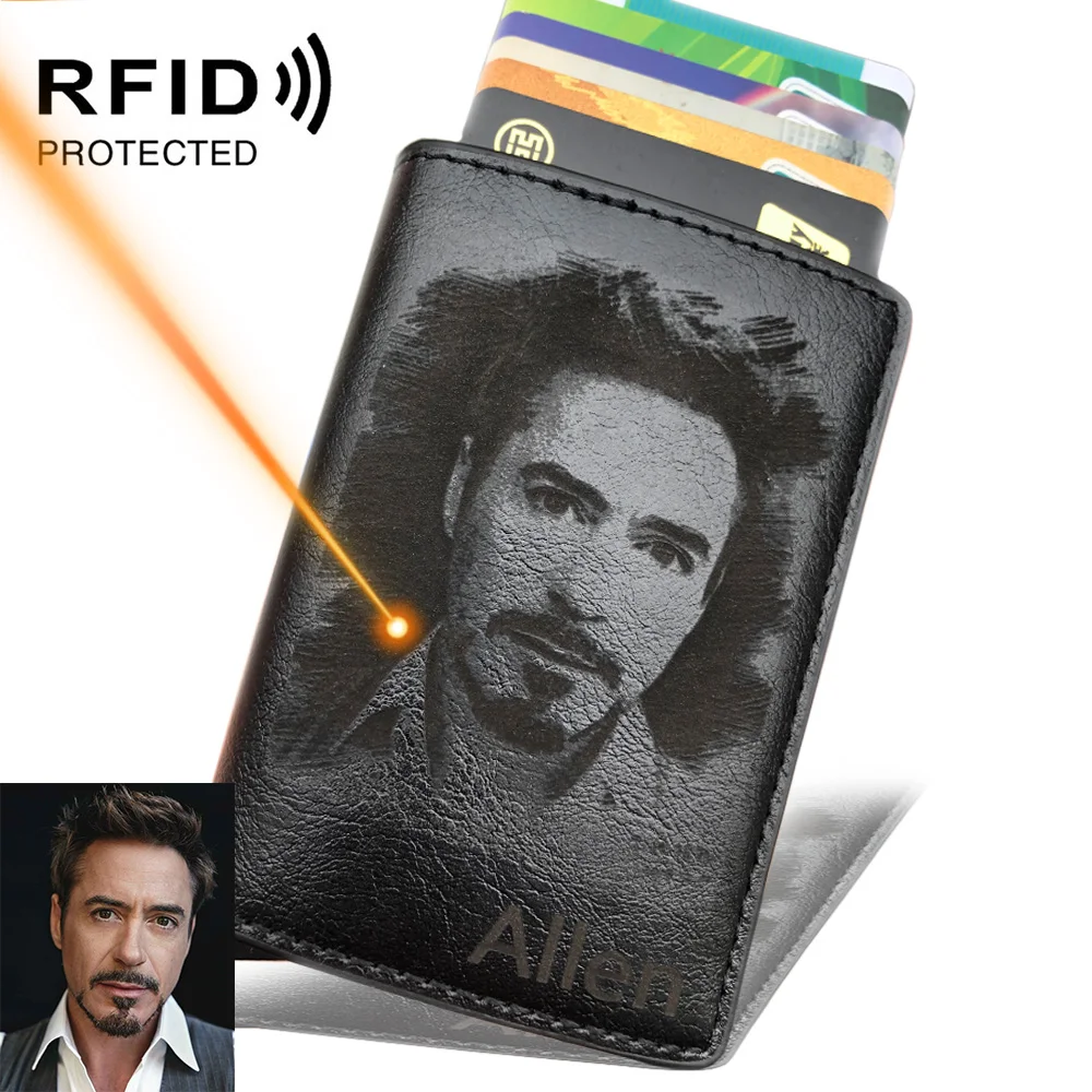Фото гравировка мужской кредитный держатель для карт Анти RFID Блокировка кожаный маленький кошелек ID карты Чехол металлическая защита кошелек Carteria