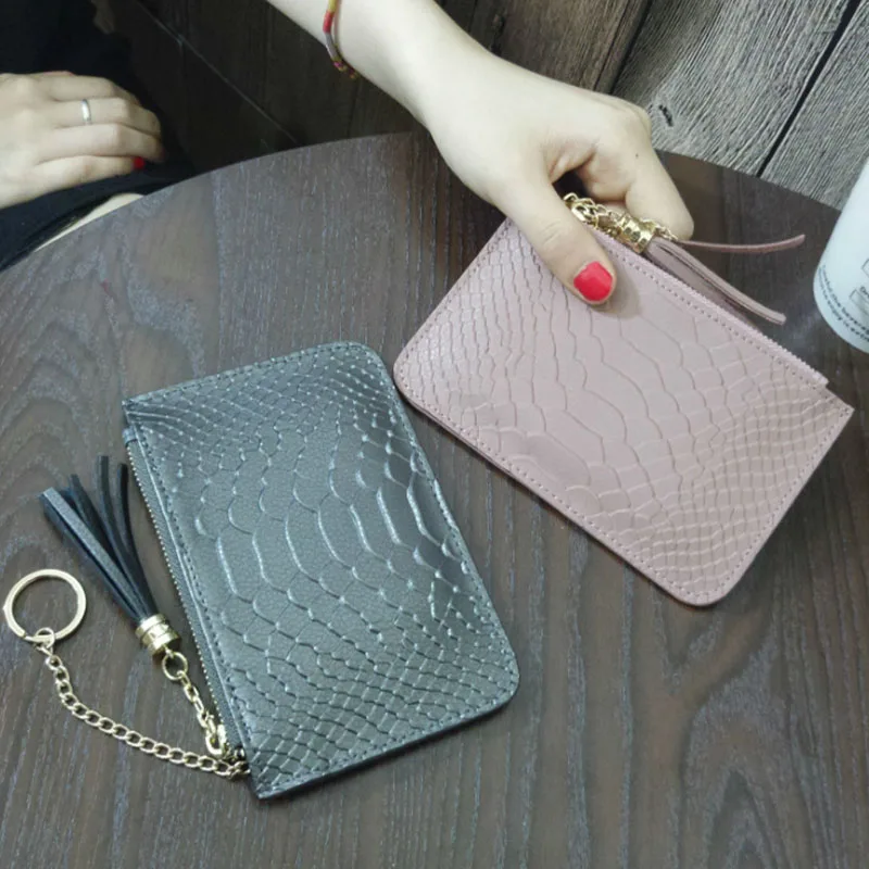 Модный женский кошелек, мини кошелек для монет с держателем для карт, натуральная кожа, сумочка со змеиным узором, короткий тонкий клатч на молнии с брелком