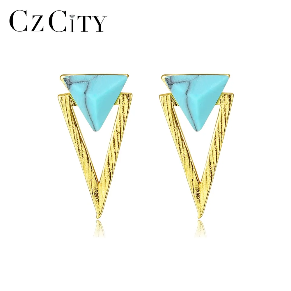 CZCITY новый 925 пробы серебро двойной Треугольники дизайн бирюзовые серьги-гвоздики для Для женщин Украшенные матовый Серьги Fine Jewelry