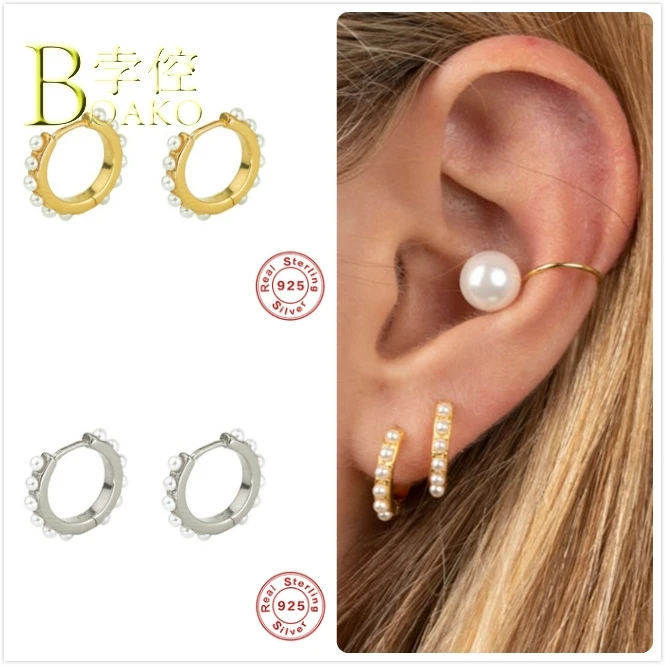 Настоящее серебро 925 пробы, серьги для женщин, золотые маленькие серьги-кольца для девушек, серьги для пирсинга костей, женские серьги в стиле панк с жемчугом и бусинами, B5