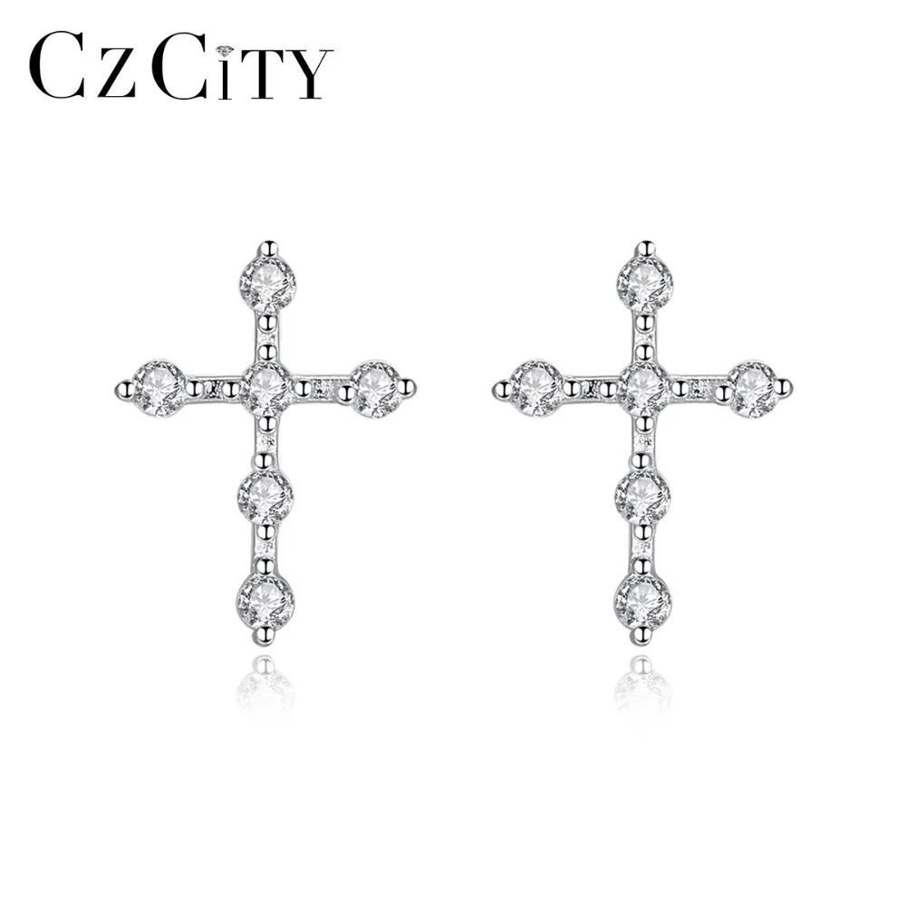 CZCITY новый сверкающий крошечный Циркон гвоздик в форме Креста серьги для Для женщин простые серьги 925 пробы Серебряные ювелирные изделия зна...