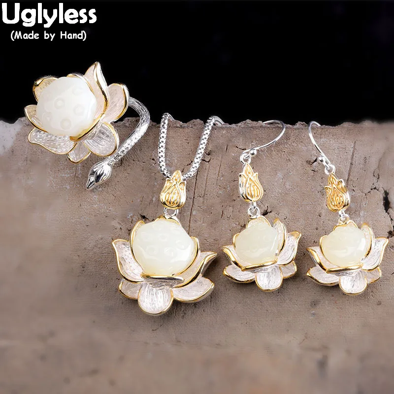 Элегантный женский ювелирный набор из белого нефрита и лотоса, Настоящее серебро 925 пробы, подвески в виде цветка лотоса, серьги, кольцо с др...