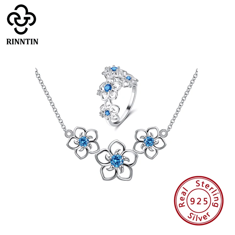 Rinntin 100% натуральная 925 пробы серебро Для женщин комплект ювелирных изделий милый цветок Дизайн AAA циркон вечерние кольца ожерелья ювелирные ...