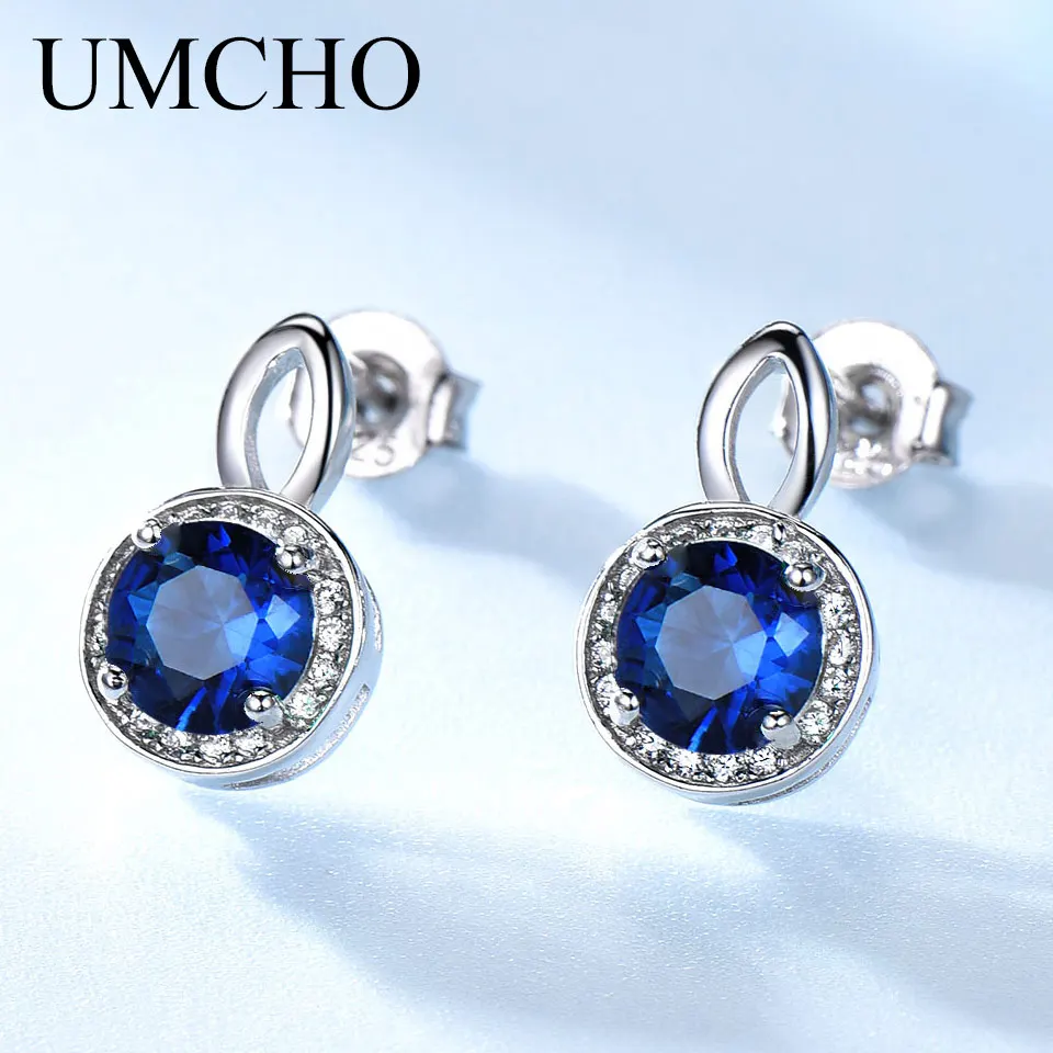 UMCHO реального 925 пробы Серебряные серьги драгоценный камень Круглый богатый Цвет нано-синий сапфир серьги стержня для подарки женщине на де...