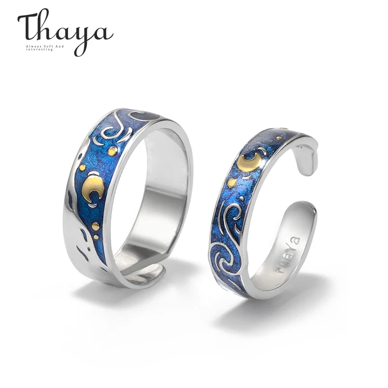 Thaya, s925 серебро, Ван Гог, эмаль, пара колец, небо, звезда, луна, блестящие кольца, обручальное кольцо, свадебные ювелирные изделия для женщин