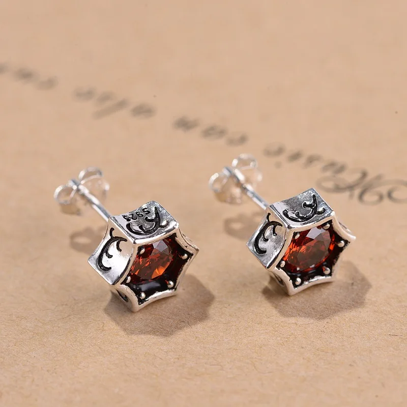 FNJ шестигранные серьги-гвоздики, 925 серебро, оригинал, Чистое Серебро S925 пробы, серьги для женщин, ювелирные изделия, красный камень циркон