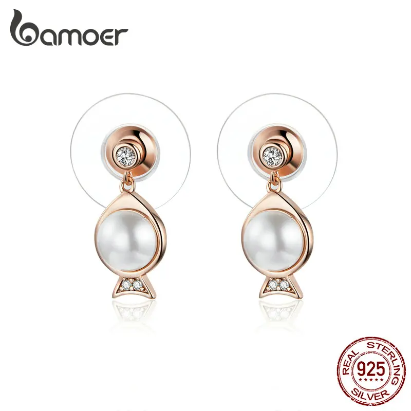 Bamoer Стерлинговое Серебро 925 Круглый жемчуг серьги с рыбками-подвесками для женщин розовое золото цвет гипоаллергенный стержень ювелирные изделия SCE798