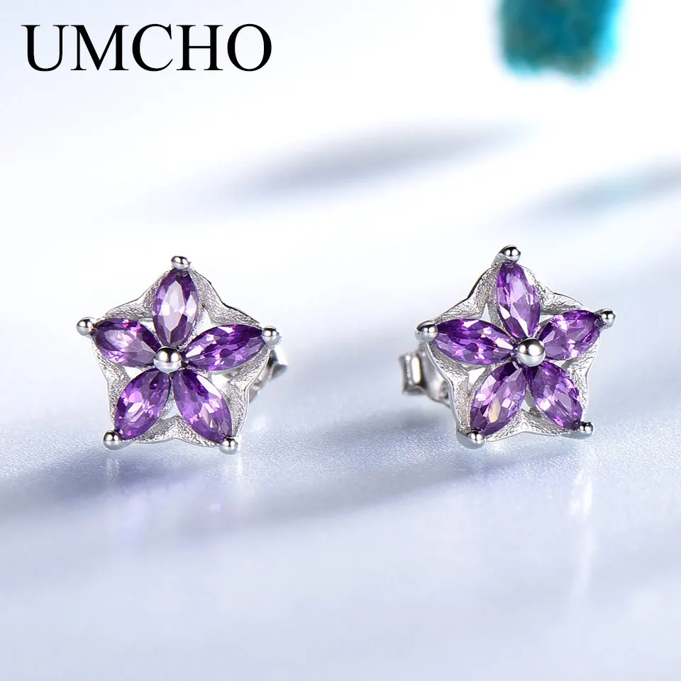 UMCHO Настоящее 925 пробы серебряные ювелирные изделия создан Nano серьги с аметистом романтический цветок серьги для женщин подарок на день рож...