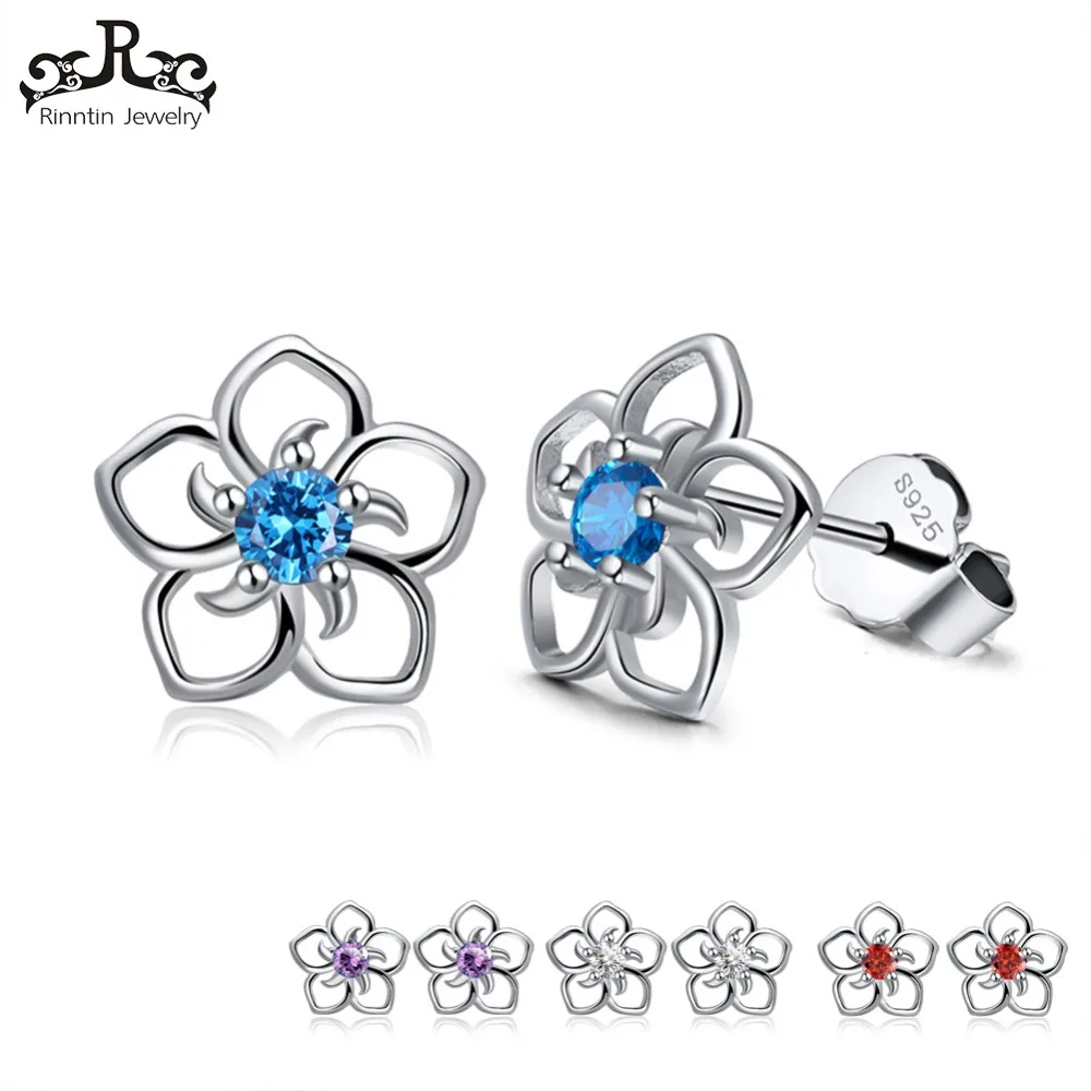 Rinntin одноцветное 925 Настоящее серебро 925 пробы Для женщин серьги-клипсы цветок синий узор AAA циркон Классический Стиль вечерние украшения ...