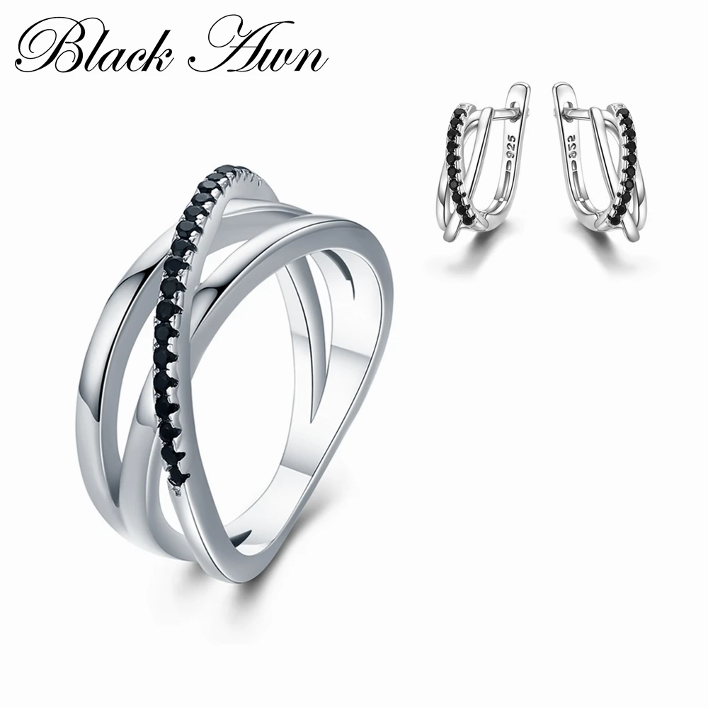 Черный, AWN, 925 пробы, серебряные ювелирные наборы, модные обручальные кольца + серьги для женщин I023 + G006