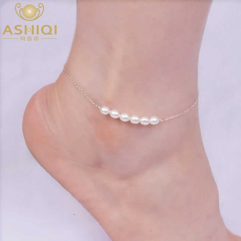 ASHIQI Настоящее 925 пробы Серебряные ножные браслеты для женщин с натуральным пресноводным жемчугом Ювелирные изделия для ног подарок