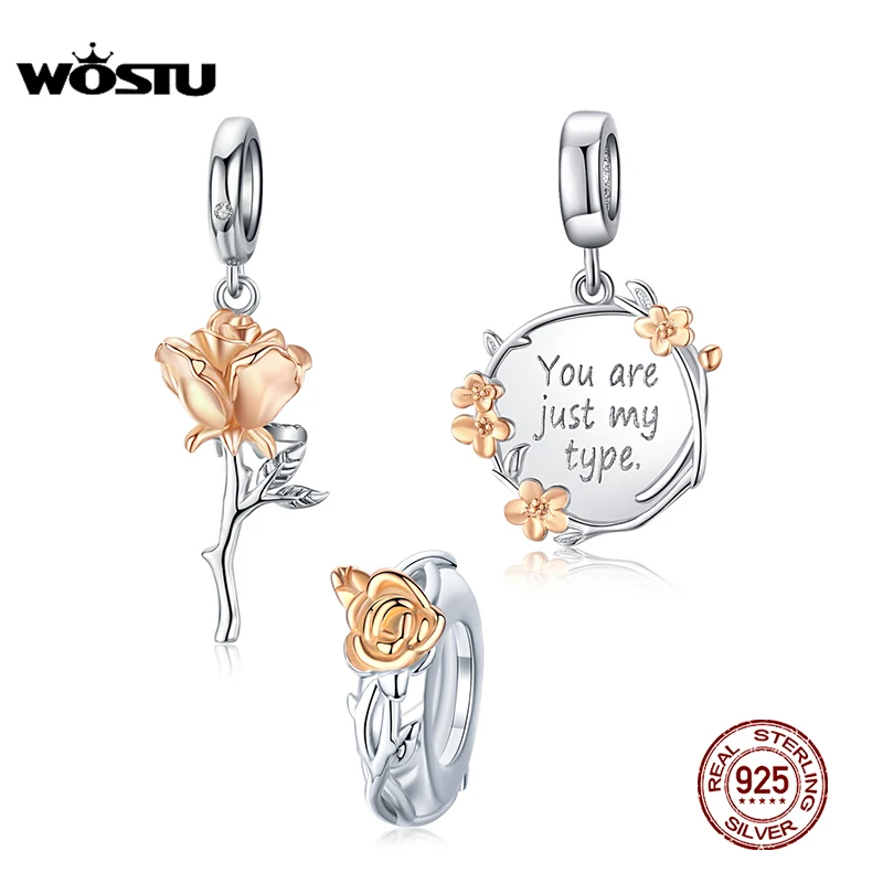 Женские розовые Цветочные Подвески WOSTU, из серебра и натурального 925 пробы, подходят к оригинальному браслету, ожерелию, подвеске на День святого Валентина