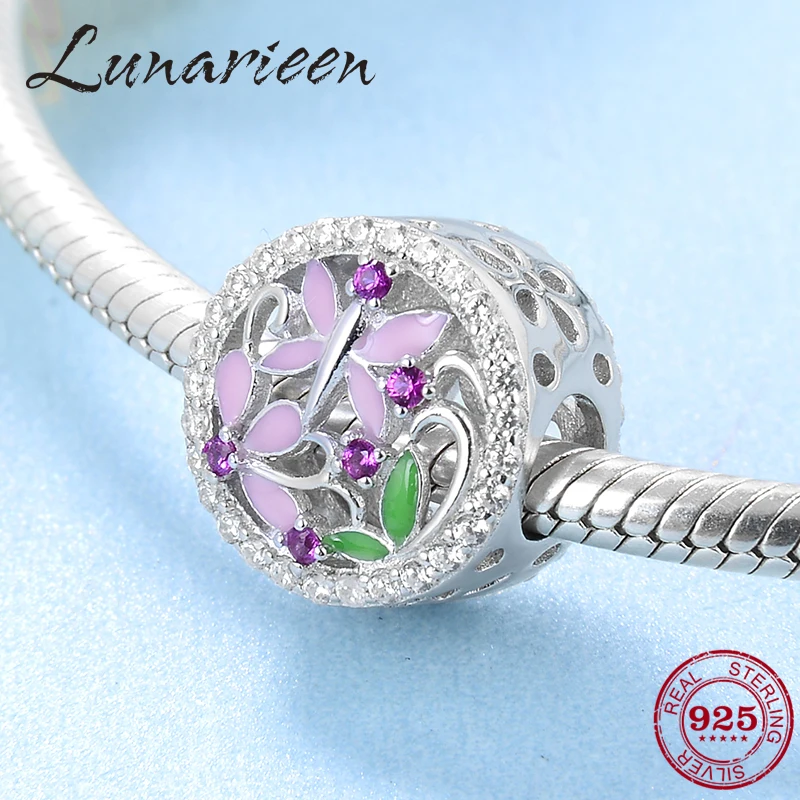 Близко к природе 925 стерлингового серебра розовый Стрекоза и цветок тонкие Бусины Подходят оригинальный Pandora браслет ювелирных изделий