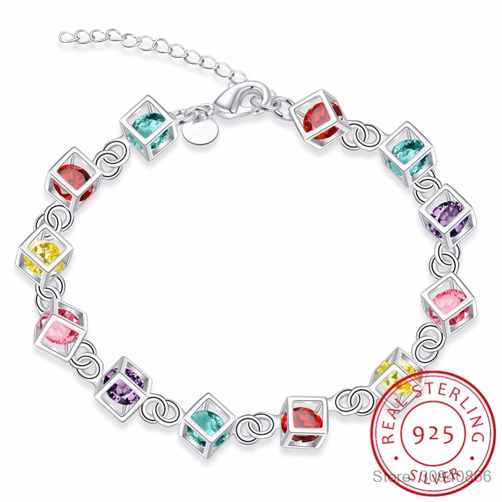 LEKANI Лидер продаж Блестящий Кристалл CZ счастье Cube 925 пробы серебро женщина девушка браслет разноцветные Куб Радуга Fine Jewelry