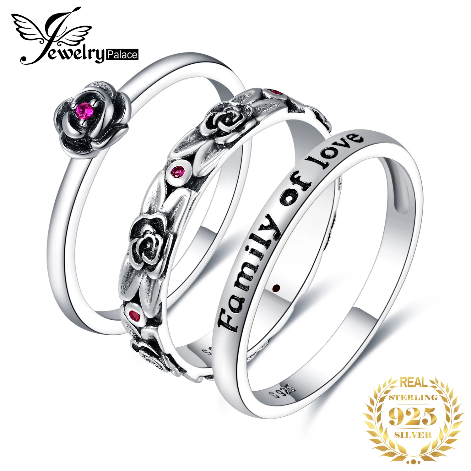 JewelryPalace Винтаж искусственный рубин цветок выгравированы черной эмалью Семья любви Stackable Ring комплекты 925 пробы серебро