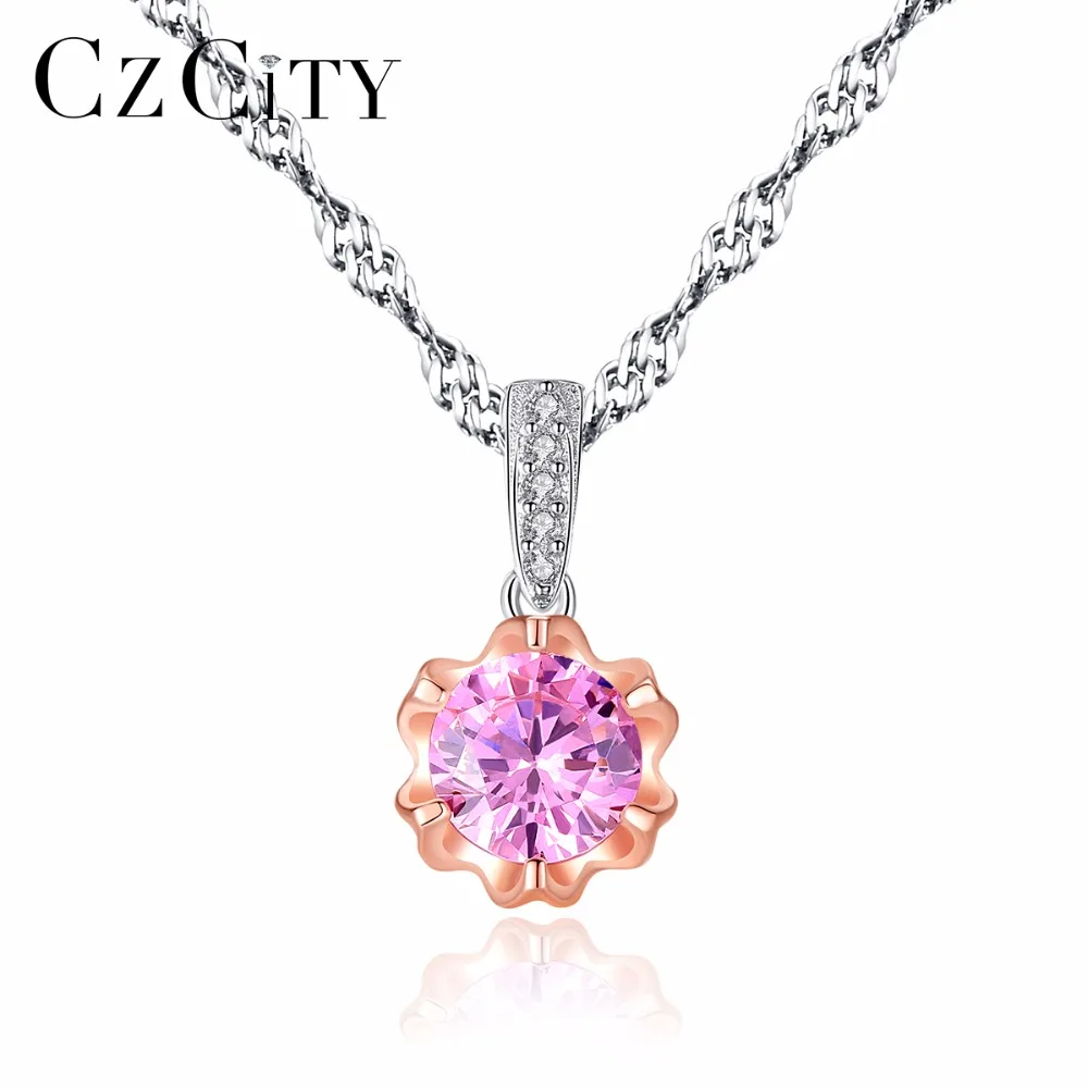 CZCITY бренд Простой стиль классический розовый Циркон Камень Блестящий женский 925 серебро 2 цвета золотой кулон ожерелье волнистая цепь подар...