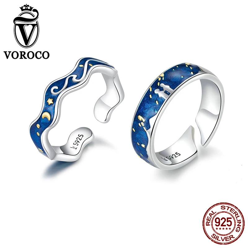 Voroco натуральный 925 пробы серебро Винтаж кольцо волнистые Ван Гог "Звездное небо" Открытое кольцо художественный ювелирные украшения накладной Луной и звездами BKR608