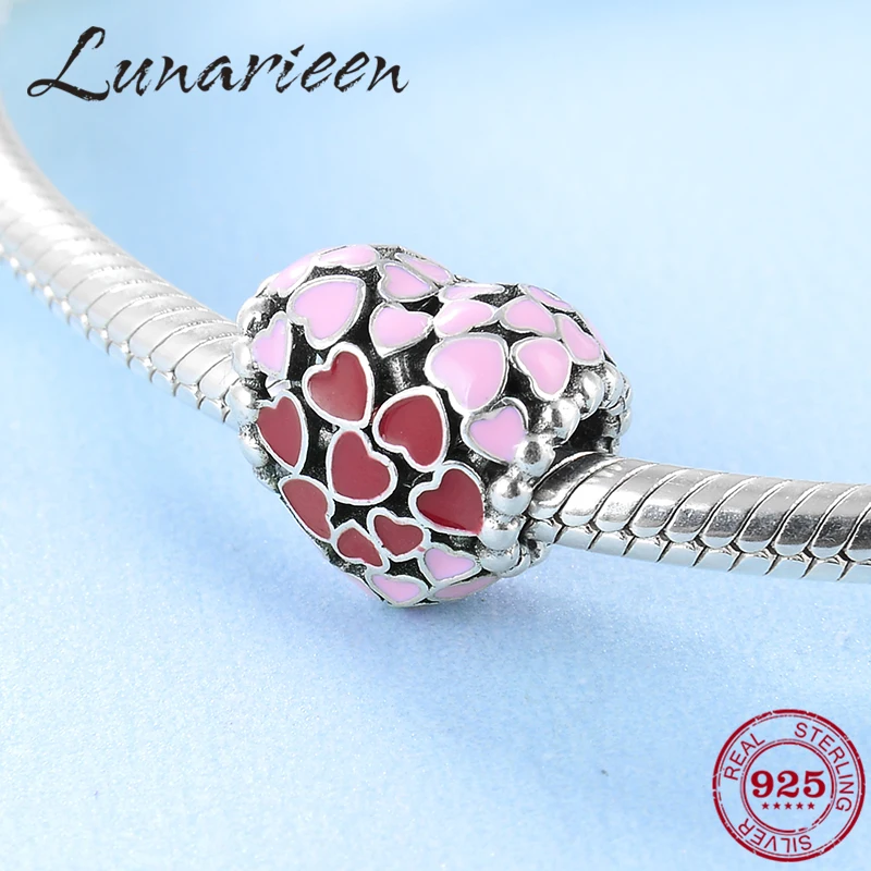 925 пробы серебро сладкий Розовый и красный цвет любовь самодельное сердечко эмалевые Бусины Подходят оригинальный Pandora очаровывательный бр...