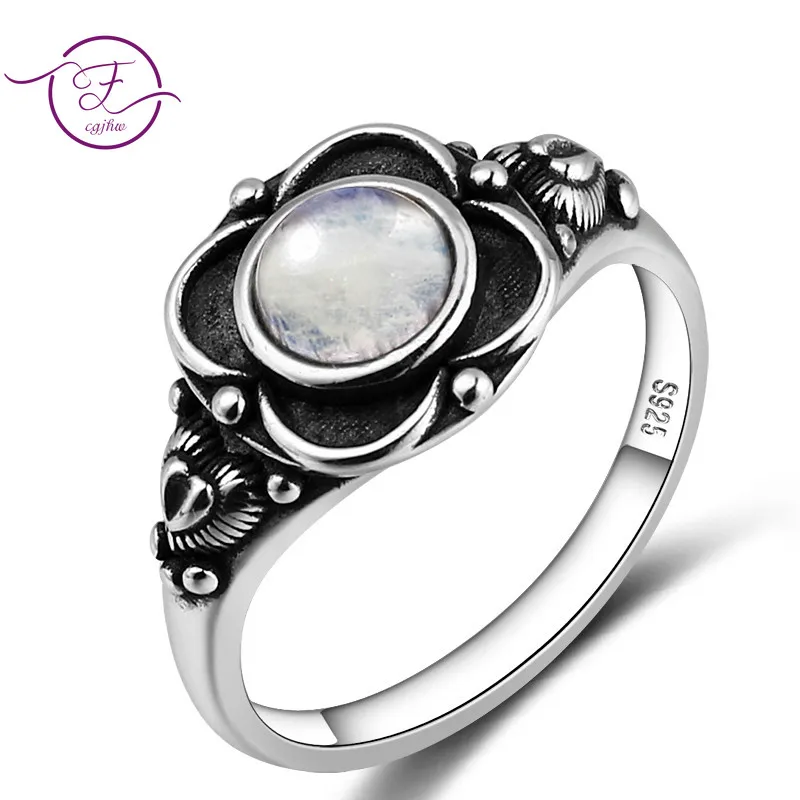 100% Кольцо из стерлингового серебра 925 пробы, Круглый 6 мм натуральный лунный камень, кольцо, винтажный цветок, помолвка Свадебная вечеринка, ...