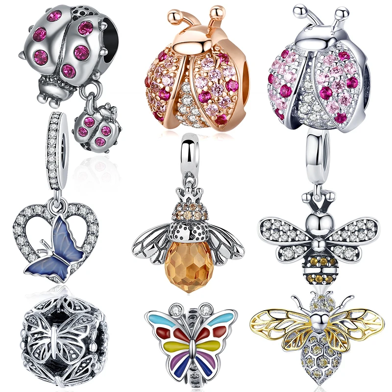 925 пробы серебряный розовый Божья коровка мигает CZ амулеты спейсер пробка бусины подходят оригинальные Пандора браслеты с подвесками ювелирные изделия