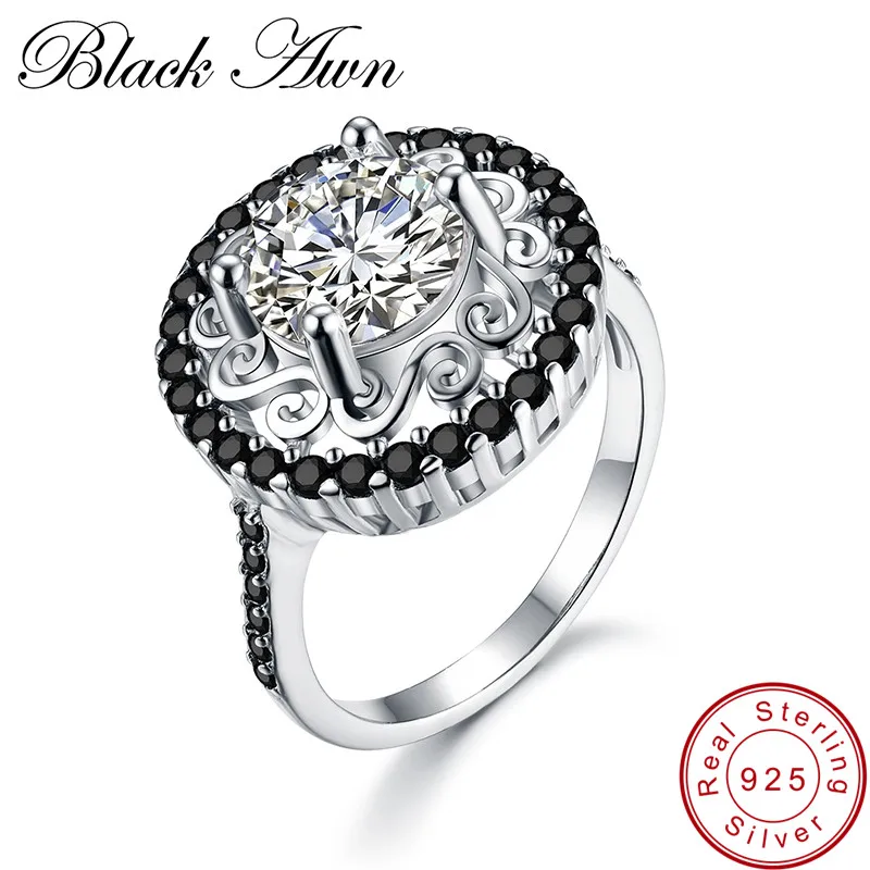 [BLACK AWN] 100% Настоящее кольцо из стерлингового серебра 925 пробы с черным цветком шпинели элегантные обручальные кольца для женщин ювелирные изделия из стерлингового серебра G032