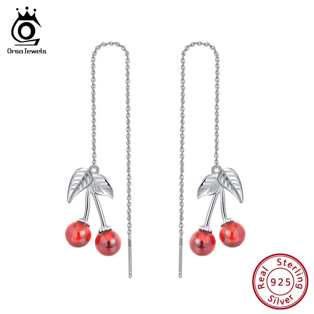 ORSA JEWELS Настоящее 925 пробы серебряные женские висячие серьги длинная цепочка Вишневый узор гранат женские вечерние романтические ювелирные изделия SE100