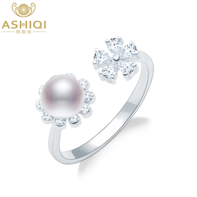 ASHIQI натуральная кольцо из стерлингового серебра 925 натуральный пресноводный жемчуг ювелирные изделия цветок Открытый палец Ясно CZ для женщ...