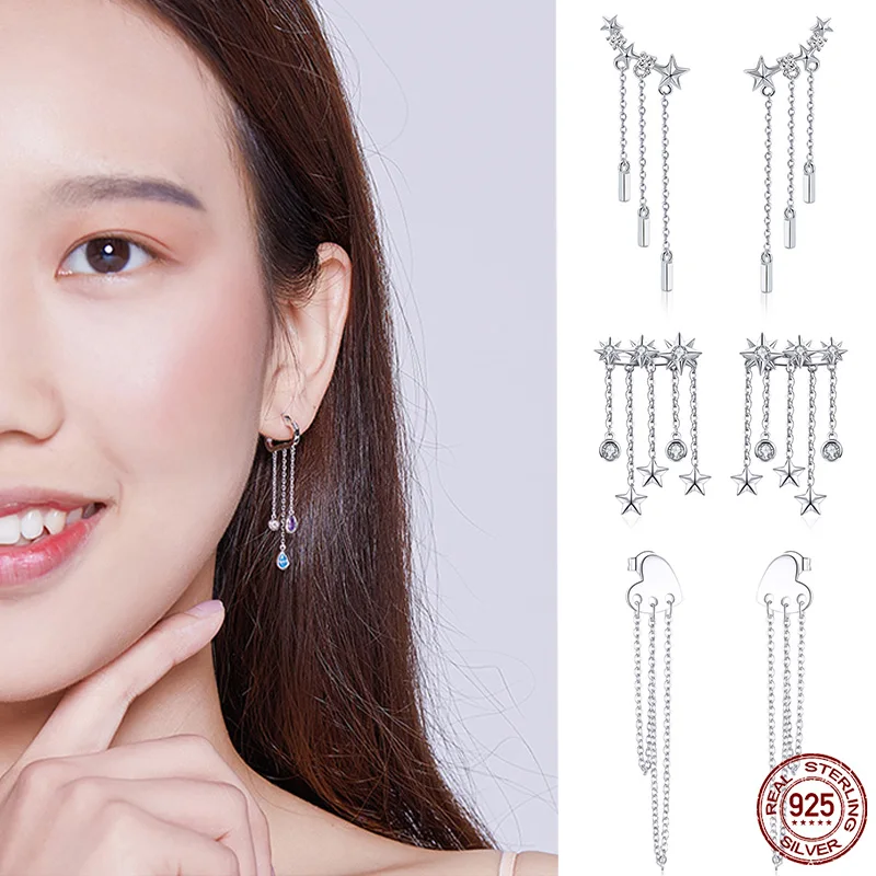 BAMOER Подлинная 925 пробы Серебряная Длинная цепочка звезда ослепительные CZ Висячие серьги для женщин модные серьги серебряные украшения SCE399