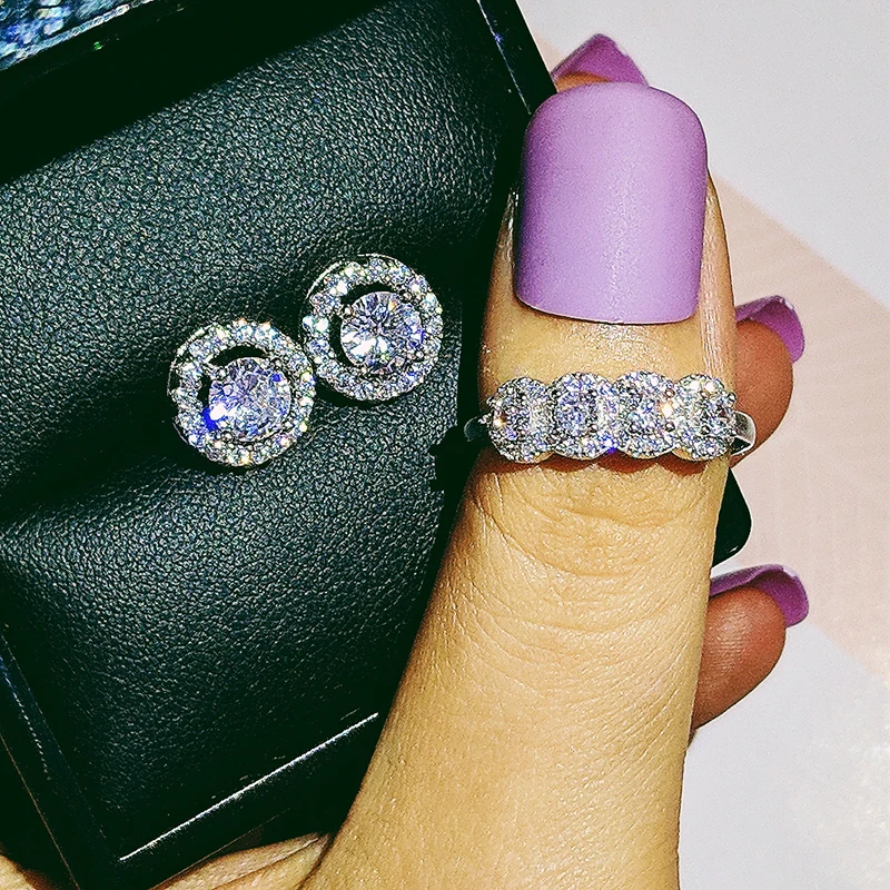 Набор украшений из стерлингового серебра 925 пробы, обручальное кольцо halo, круглые серьги-гвоздики для свадьбы, подарок на день Святого Валентина, вечерние, оптовая продажа J5570