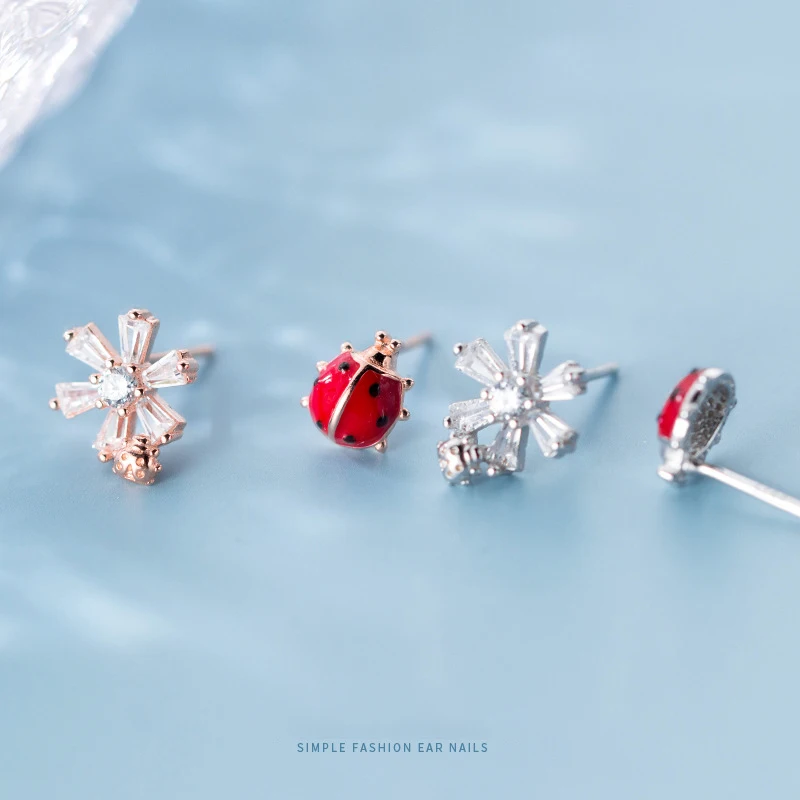 Modian, блестящие, циркониевые, цветущий цветок, Красная эмаль, милые серьги-гвоздики с жуком для женщин, 925 пробы, серебряные асимметричные серьги, ювелирные изделия