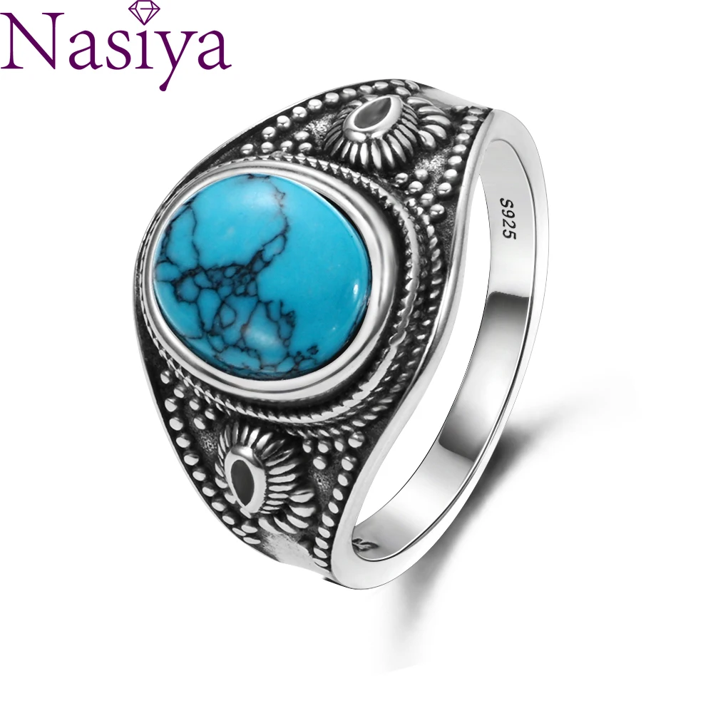 925 пробы серебряные ювелирные изделия Ретро овальное кольцо для мужчин женщин натуральный бирюзовый 8x10 мм подарок оптовая продажа вечерние