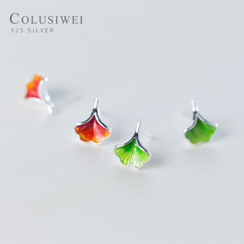 Colusiwei, Новое поступление, серьги-гвоздики в виде листьев гинкго билоба для женщин, зеленые, красные, эмалированные, 925 пробы, серебряные, стил...