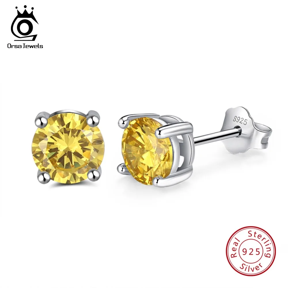 ORSA JEWELS, настоящее 925 пробы, серебряные серьги-гвоздики для женщин, AAA, желтый кубический циркон, Мини размер, серьги, модное ювелирное изделие, SE84-Y