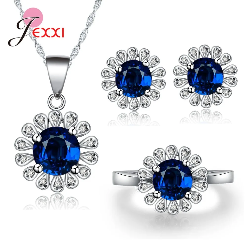 Jemmin Новый сверкающих синий круглый кубический цирконий 100% 925 пробы ленты Элегантный большой ожерелье с подсолнухом серьги кольца набор