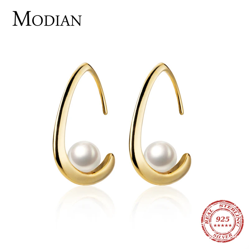 Женские серьги-подвески Modian, элегантные серьги золотистого цвета с жемчугом в форме капли из стерлингового серебра 925 пробы, ювелирные украшения