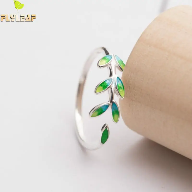 Flyleaf 100% Серебро 925 пробы Эмаль Зеленые листья оливковой ветви Открытые Кольца для женщин креативные женские модные ювелирные изделия