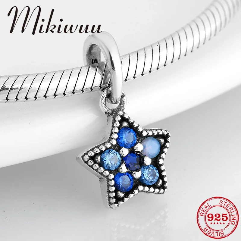 925 стерлингового серебра пятиконечная звезда сверкающие синие циркониевые бусины Подвески Ювелирные изделия подходят оригинальный Pandora Ша...